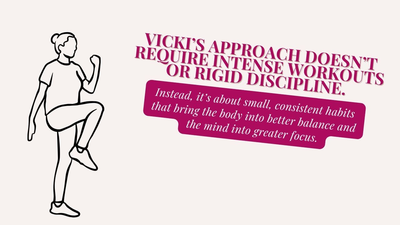 Vicki’s approach doesn’t require intense workouts or rigid discipline. Instead, it’s about small, consistent habits that bring the body into better balance and the mind into greater focus. Whether you’re in your 30s or your 80s, these principles can help you move through life with more ease and that, ultimately, is what aging well is all about.
