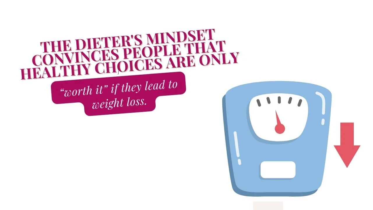 The dieter’s mindset can also be harmful. It convinces people that healthy choices are only “worth it” if they lead to weight loss. It is the thought pattern that says, “Why eat broccoli if I’m not losing weight?”