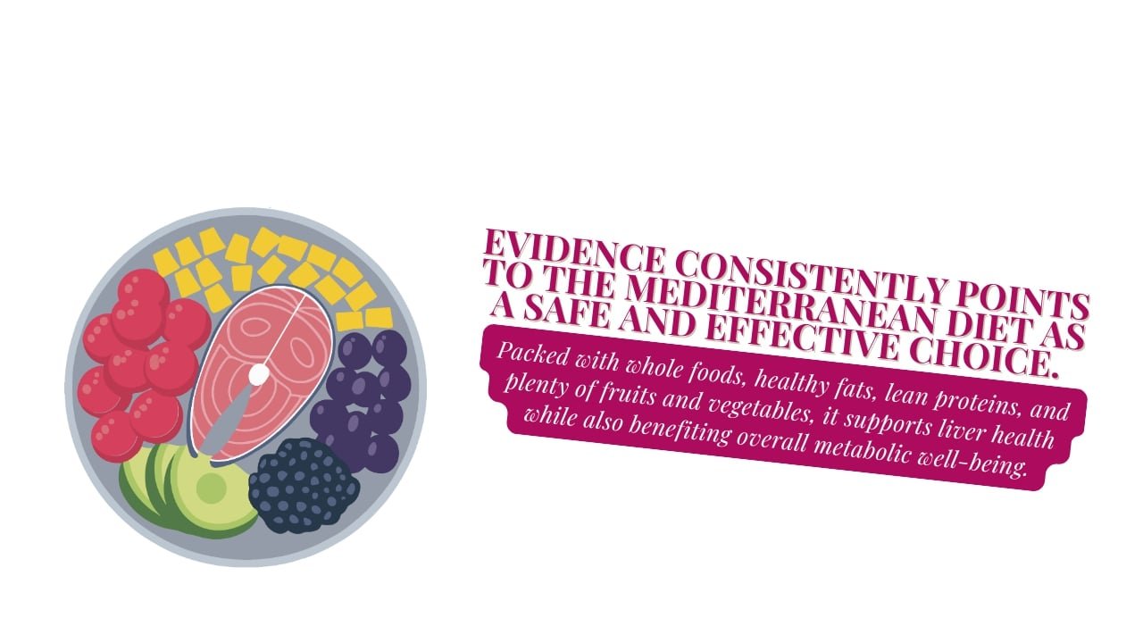 When it comes to dietary guidance for fatty liver disease, the main focus is on overall nutrition and calorie-appropriate eating. Evidence consistently points to the Mediterranean diet as a safe and effective choice. Packed with whole foods, healthy fats, lean proteins, and plenty of fruits and vegetables, it supports liver health while also benefiting overall metabolic well-being.