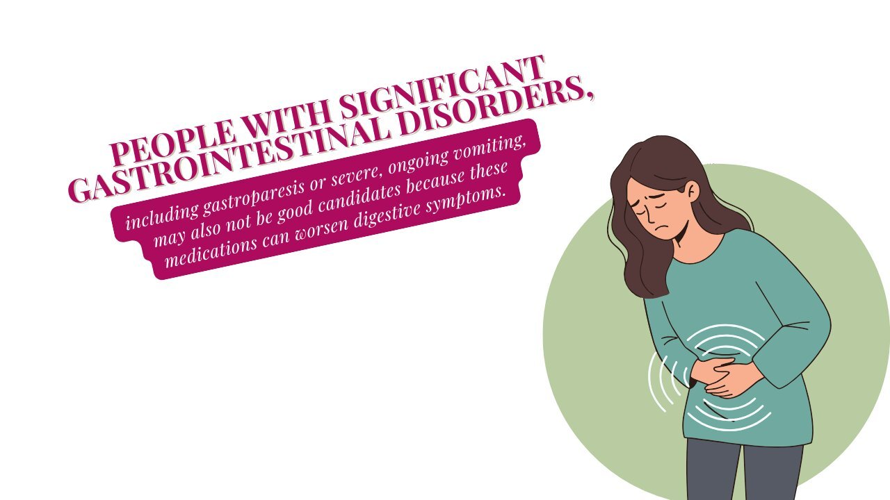 For GLP-1–based medications such as semaglutide (Wegovy) and tirzepatide (Zepbound), the main contraindication is a personal or family history of medullary thyroid cancer or Multiple Endocrine Neoplasia syndrome type 2 (MEN2), a rare genetic condition linked to increased thyroid cancer risk. People with significant gastrointestinal disorders, including gastroparesis or severe, ongoing vomiting, may also not be good candidates because these medications can worsen digestive symptoms.
