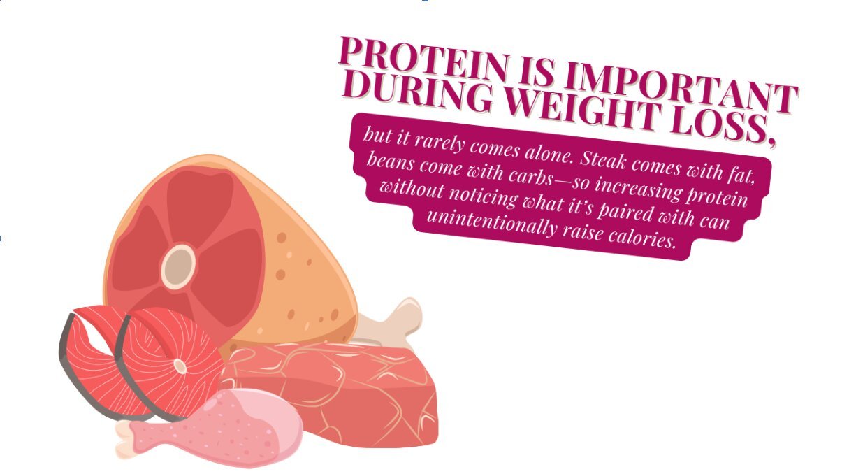 Protein is important, especially during weight loss, but it rarely comes alone. A steak, for example, brings both protein and fat. Plant-based options like beans come with protein and carbs. So increasing protein without paying attention to what comes with it can unintentionally increase calories.