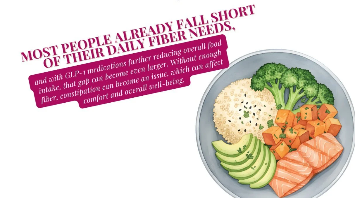 Previously, higher fiber intake was easier to achieve through larger portions of vegetables, fruits, and whole foods. But since GLP-1 medications reduce appetite and food volume, many people simply cannot eat enough high-fiber foods to meet their needs. In those cases, adding a fiber supplement can help maintain regular digestion.