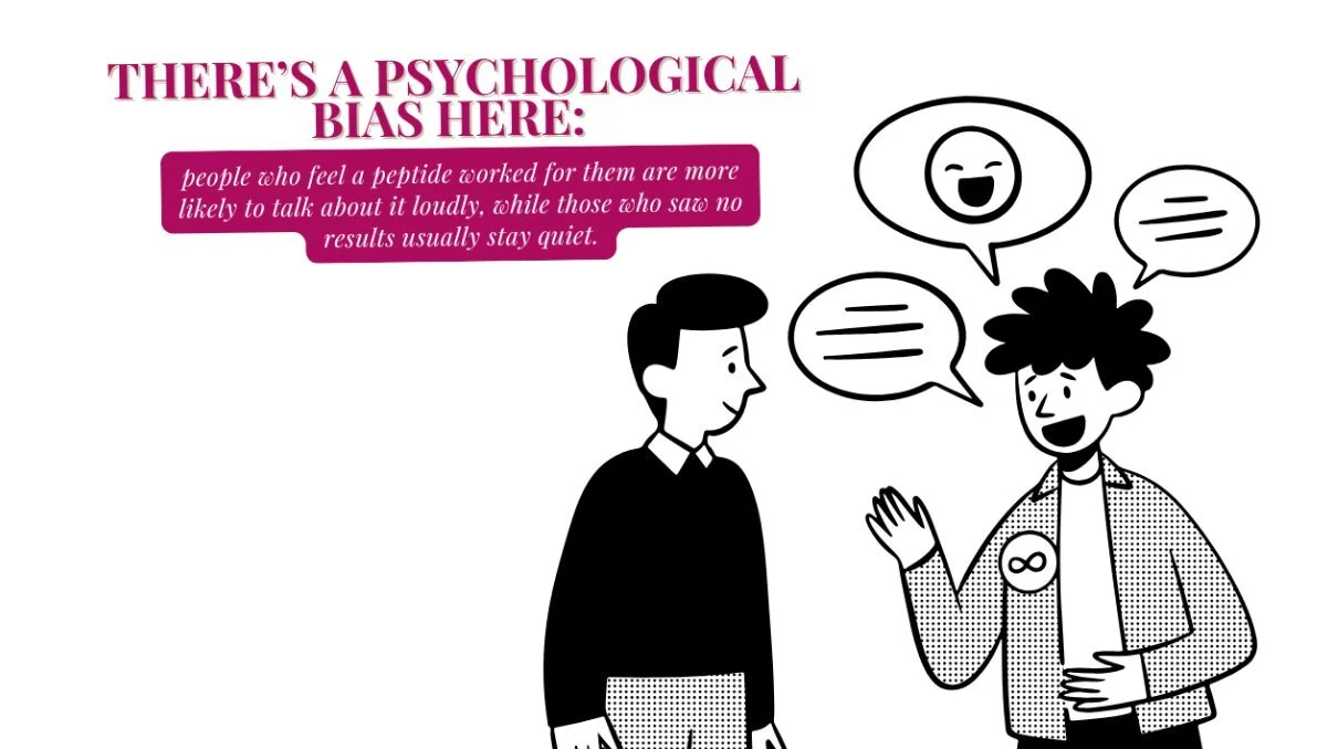 There's also a well-documented psychological bias making this even murkier. People who feel a peptide worked for them tend to talk about it loudly — think of it like the diet culture version of this, where everyone who lost weight on a specific plan becomes its loudest advocate, while the people it didn't work for just kind of quietly move on. When you layer in the placebo effect — especially with something that involves injections and a significant price tag — it becomes really hard to parse what's actually happening. And even in cases where evidence does exist, the picture isn't exactly reassuring. AOD 9604, a growth hormone fragment marketed for fat loss, actually has published trials, making it more studied than most. Yet its Phase 2b/3 trial showed no superior weight loss compared to placebo (meaning no drug). It failed its primary outcome. And yet it's still being widely promoted as an effective weight loss tool. That's the information vacuum in full effect — either there's no data, or the data that exists doesn't support the claims being made.