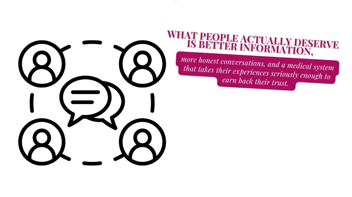 The problem, though, is that distrust in a flawed system doesn't automatically make the alternative safer or better. Rejecting something because it's "conventional" isn't the same as rejecting it because the evidence doesn't support it — those are actually really different things. And embracing something because it feels like reclaiming control over your health isn't the same as making a truly informed choice. That tension is worth sitting with, because the answer here isn't blind trust in institutions — but it's also not blind rejection of evidence. What people actually deserve is better information, more honest conversations, and a medical system that takes their experiences seriously enough to earn back their trust. Because until that happens, the gap is just going to keep getting filled by things we know very little about.
